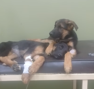 Como estão ambos deitados na cama do veterinário, o filhote macho parece estar propositadamente segurando a cabeça de sua irmã com suas patas. Os dois filhotes de pastor alemão foram levados à clínica de um veterinário, no Cairo, para serem tratados para parvovirose.