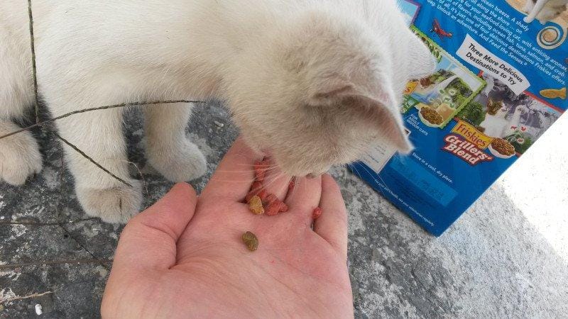 Um jovem e um amigo passavam por uma área onde não tinha ninguém e viu a gatinha que parecia estar com fome. Ela tinha só 2 meses, era bem filhote, tinha um monte de pulga e estava muito magrinha. Com pena da gatinha, resolveu comprar ração em uma loja próxima para alimentá-la. Ela, claro, comeu tudo com vontade!