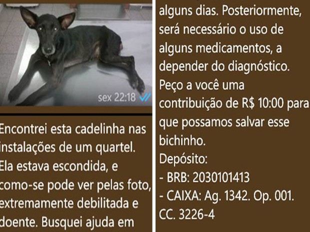 A cadela passou por uma série de exames em uma clínica veterinária de Taguatinga, onde está internada. O tratamento custou R$ 1 mil. Segundo o policial, cerca de R$ 650 já foram arrecadados entre amigos de trabalho e familiares.